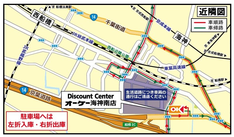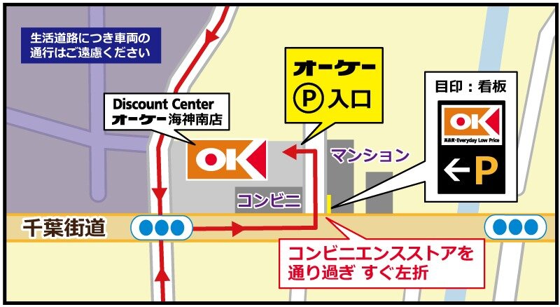 『高品質・Everyday Low Price』ディスカウントセンター オーケー海神南店(千葉県船橋市)のご案内です。店舗からのお知らせ、取扱商品、チラシ掲載商品、駐車場台数、地図、営業時間、電話番号、アクセス方法などを掲載しています。