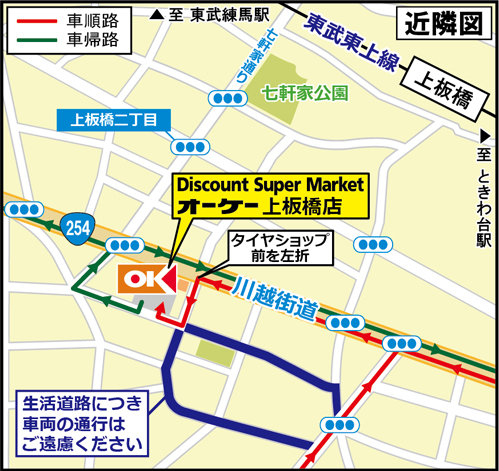 『高品質・Everyday Low Price』ディスカウントスーパーマーケット オーケー上板橋店(東京都板橋区)のご案内です。店舗からのお知らせ、取扱商品、チラシ掲載商品、駐車場台数、地図、営業時間、電話番号、アクセス方法などを掲載しています。