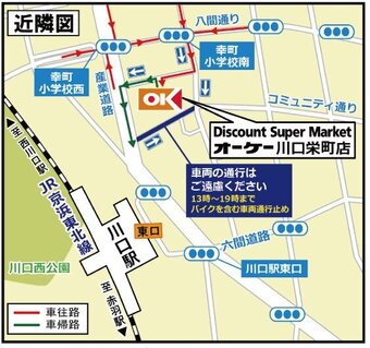 『高品質・Everyday Low Price』ディスカウント・スーパーマーケット オーケー川口栄町店(埼玉県川口市)のご案内です。店舗からのお知らせ、取扱商品、チラシ掲載商品、駐車場台数、地図、営業時間、電話番号、アクセス方法などを掲載しています。