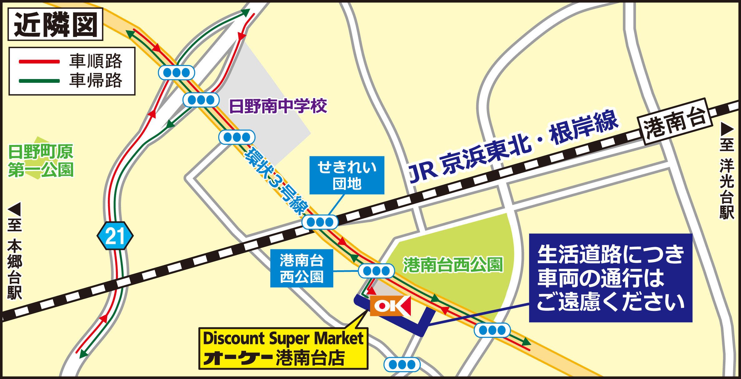 『高品質・Everyday Low Price』ディスカウントスーパーマーケット オーケー港南台店(神奈川県横浜市港南区)のご案内です。店舗からのお知らせ、取扱商品、チラシ掲載商品、駐車場台数、地図、営業時間、電話番号、アクセス方法などを掲載しています。