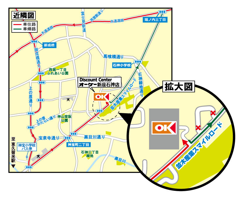 『高品質・Everyday Low Price』ディスカウントセンター オーケー新座石神店(埼玉県新座市)のご案内です。店舗からのお知らせ、取扱商品、チラシ掲載商品、駐車場台数、地図、営業時間、電話番号、アクセス方法などを掲載しています。