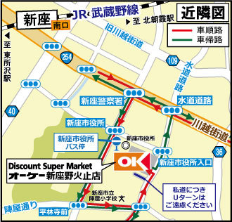 『高品質・Everyday Low Price』ディスカウントスーパー オーケー新座野火止店(埼玉県新座市)のご案内です。店舗からのお知らせ、取扱商品、チラシ掲載商品、駐車場台数、地図、営業時間、電話番号、アクセス方法などを掲載しています。