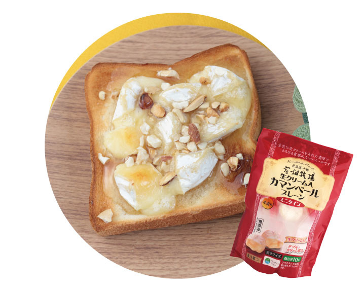 1.カマンベールチーズを1/4カットにし、食パンの上に並べ、トースターで3分温めます。