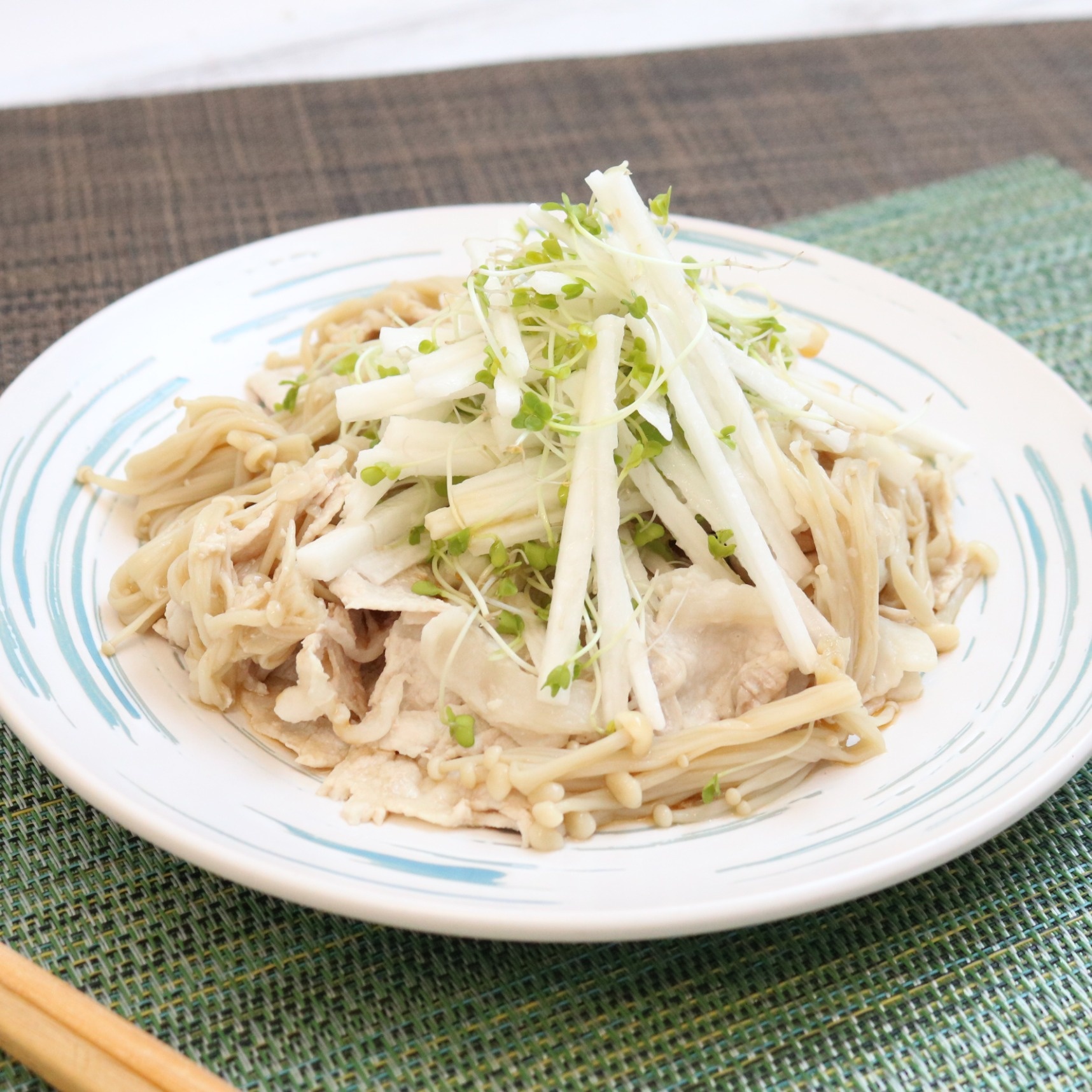 長芋とスプラウトのさっぱりレンジ蒸し 〔材料〕2人分 長芋:100g えのき:1/2袋 ブロッコリースーパースプラウト:1/4パック 豚ロース肉うすぎり:150g 酒:大さじ1 塩:適量 ぽん酢:適量 〔作り方〕 1.豚肉は食べやすい大きさに切ります。えのきは石づきを切り落とし、手でほぐします。 2.長芋は皮をむき、千切りにし、スプラウトと混ぜ合わせます。 3.耐熱皿に【1】を入れて酒・塩をかけ、ふんわりとラップをかけて電子レンジ600Wで8分加熱します。 4.器に【3】・【2】の順に盛り付けて完成です。ぽん酢をかけて、お召し上がりください。