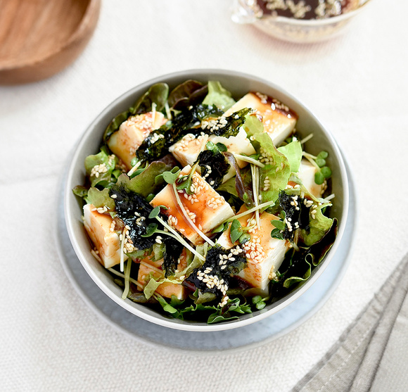 カリスマ主婦ブロガーつきさんこと長田知恵さんが提案!『さっぱり旨辛!韓国風豆腐サラダ』 〔材料〕2人分 木綿豆腐:1/2丁(200g) かいわれ菜:1/2株 サニーレタス:4枚 韓国のり:適量 【A】 コチュジャン、しょうゆ:各大さじ1 砂糖、酢:各小さじ1 ごま油:小さじ2 おろしにんにく:小さじ1/2 白いりごま:適量 〔作り方〕 1.豆腐はひと口大に切ってペーパーで包んで 水気を切ります。かいわれ は根元を切ります。 レタスは手でちぎります。【A】は混ぜ合わせます。 2.器に【1】の野菜と豆腐を盛り、【A】をかけ、 韓国のりを散らして完成です。