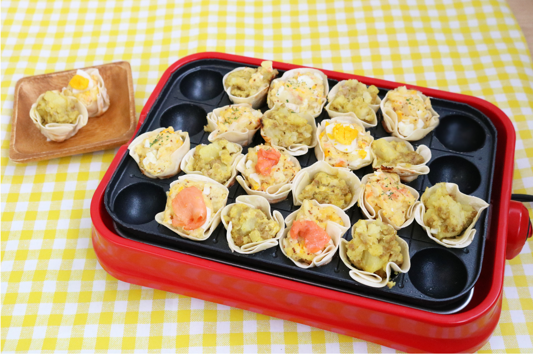 1.たこ焼き器にキッチンペーパーで油をぬり、餃子の皮を敷きつめ、ポテトサラダを入れます。