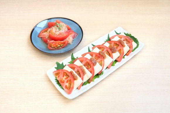 3.大葉を敷いた器に、粗熱を取った【1】・梅・トマトが交互になるように並べたら、