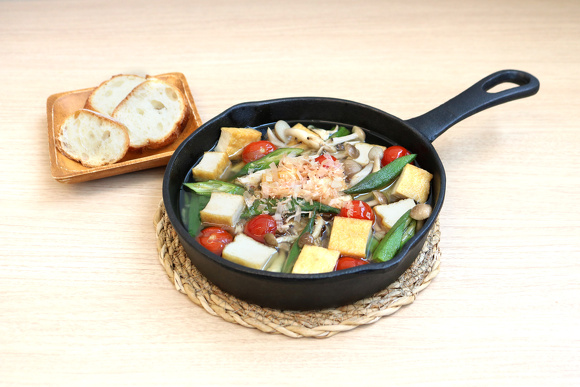 ※今回はオクラ・ミニとまと・しめじ・厚揚げを使用しました。
