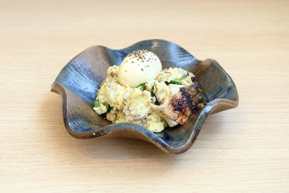 煮玉子と飾り用のさばをのせて、黒こしょうを振りかけたら完成です。