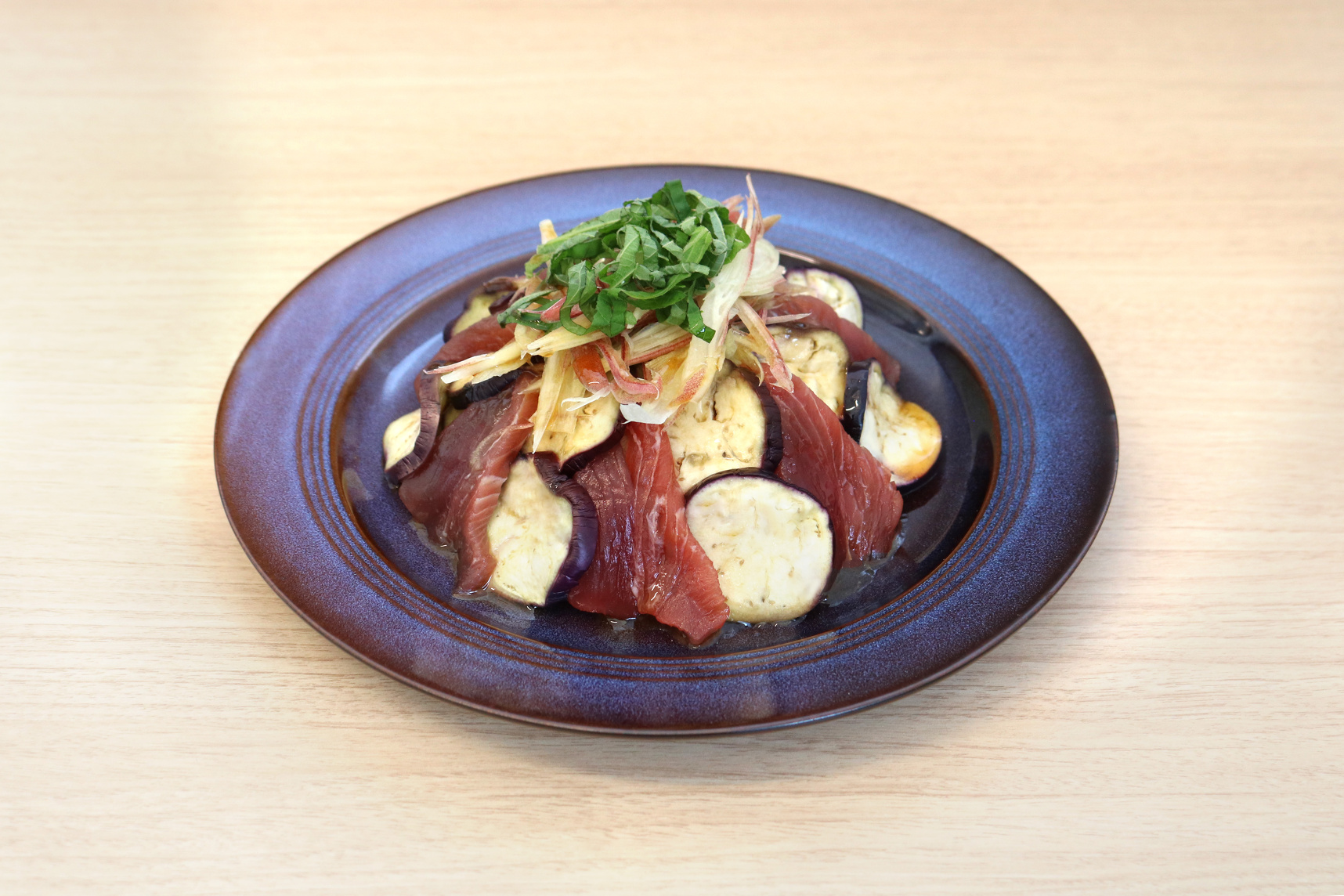 3.【2】と かつおの刺身を器に盛り付けたら、大葉とみょうがをのせ、混ぜ合わせた【A】をかけて完成です。
