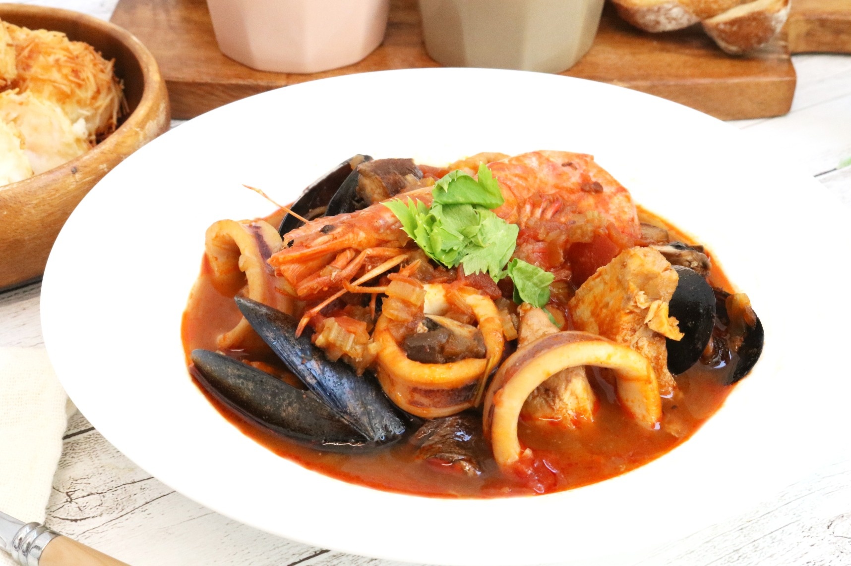 2. えびは殻のまま、背中に切れ目を入れて背ワタを取り除き、いかは解凍して1㎝幅で輪切り、めかじきは一口大に切り、ムール貝は解凍します。