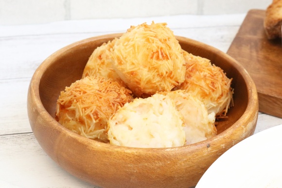 4. 【2】のビニールの端を切り、絞り出しながら適当な大きさに丸め、水溶き薄力粉にくぐらせ【3】を全体につけます。