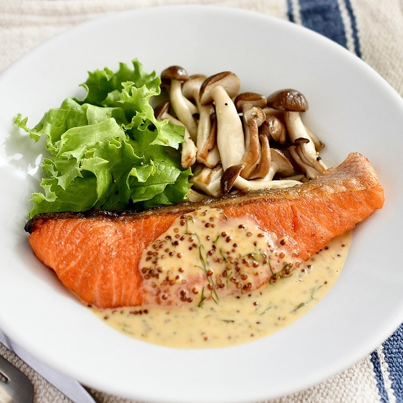 カリスマ主婦ブロガーつきさんこと長田知恵さんが提案!『焼いてかけるだけ♩鮭のディルマヨソース』 〔材料〕2人分 鮭の切り身:2切れ 塩、こしょう:各少々 小麦粉:適量 有塩バター:10g 【A】 マヨネーズ:大さじ2 粒マスタード:大さじ1 はちみつ:小さじ2 しょうゆ:小さじ1 ディル:小さじ1~お好みで 〔作り方〕 1.鮭に塩、こしょうをし、小麦粉をまぶします。【A】は混ぜておきます。 2.フライパンにサラダ油(分量外)小さじ2を入れ、中火で熱し、鮭を並べ入れます。 4分ほど焼いて裏返し、さらに2分焼きます。 3.焼けたら余分な脂を拭き取り、バターを加えて全体に絡めます。 4.器に盛り、【A】をかけて出来上がり。
