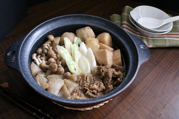 1.牛肉は一口大に切ります。里芋は皮をむいて一口大に切り、水で洗ってぬめりを取ります。ねぎは斜め切りにし、しめじは石づきを切り、小房に分けます。こんにゃくはスプーンで一口大にちぎって下ゆでします。