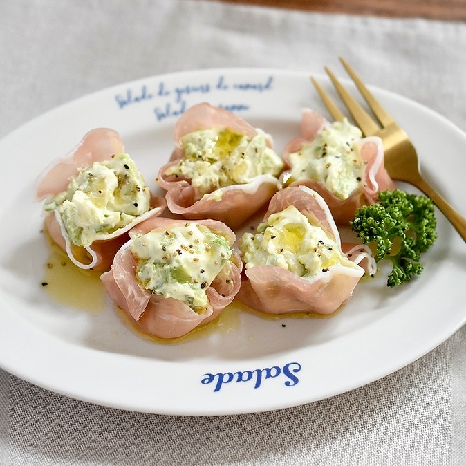 カリスマ主婦ブロガーつきさんこと長田知恵さんが提案!『5分でオシャレ♩アボカドチーズの生ハム包み』 〔材料〕5個分 生ハム:5枚 クリームチーズ:40g アボカド:1/2個 レモン汁:小さじ1 オリーブオイル:適量 塩、粗びき黒こしょう:各少々 〔作り方〕 1.ボウルにクリームチーズを入れ、クリーム状になるまで練ります。 2.小さく切ったアボカドとレモン汁を【1】に加え、 軽く潰しながら混ぜます。 3.【2】を生ハムで包んで器に盛り、オリーブオイルを回しかけ、塩と黒こしょうをふって完成です。