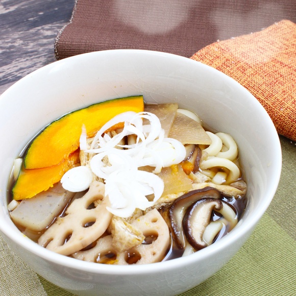 1.かぼちゃは8mm幅の薄切りにします。だいこんは2mm幅のいちょう切りにします。れんこんは5mm幅の半月切りにします。しいたけは軸を切り、2mm幅の薄切りにします。こんにゃく・油揚げは2mm幅の短冊切りにします。