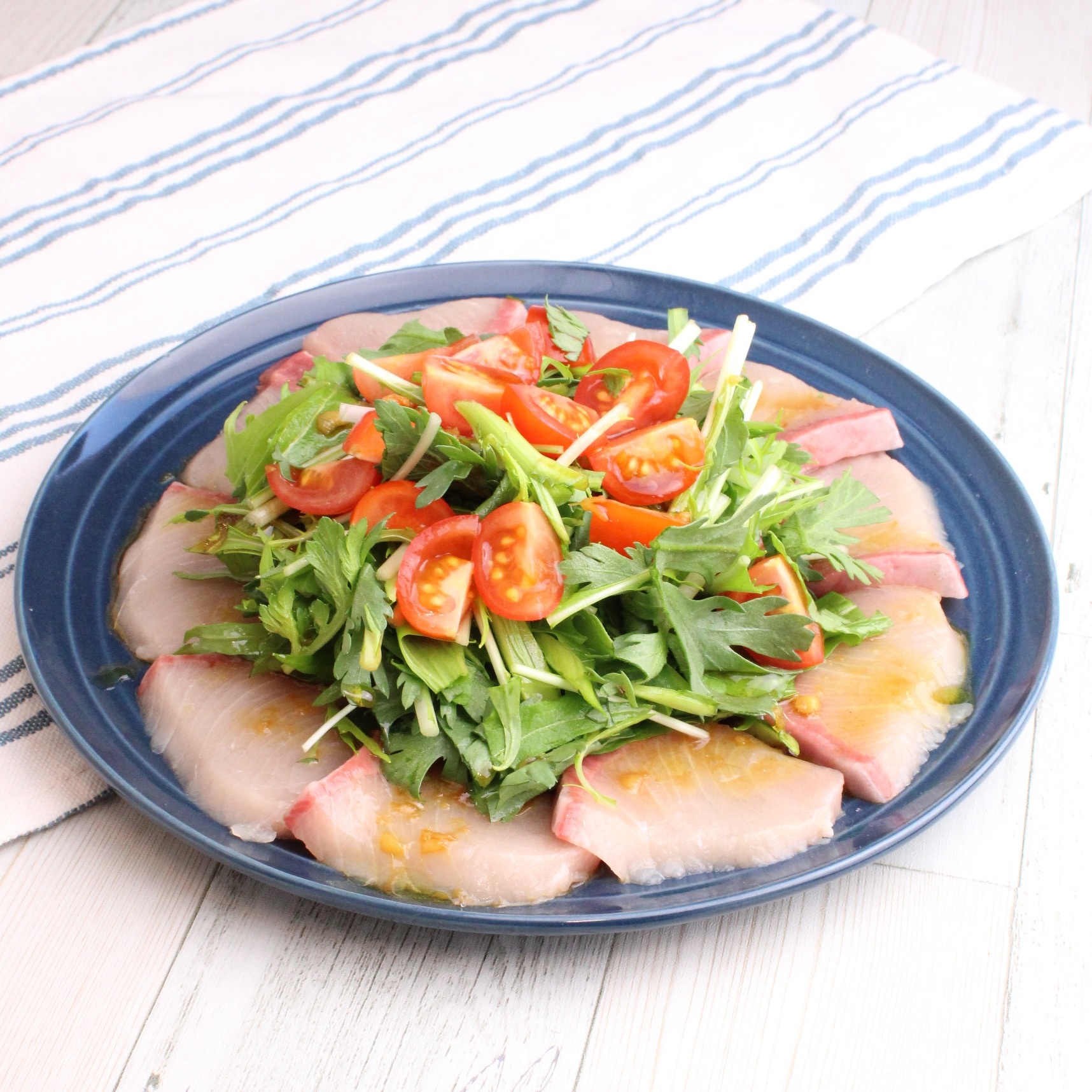 春菊と水菜のシャキシャキぶりカルパッチョ 〔材料〕2人前 春菊(きくな):1/2束 水菜:1/2束 ミニとまと:4個 ぶり (刺身):1サク 【A】 しょうゆ:大さじ1 レモン汁:大さじ1 オリーブオイル:大さじ1 しょうが(チューブ):1cm こしょう:少々 〔作り方〕 1.春菊は茎と葉に切り分け、茎は斜め薄切り、葉は3cm幅に切ります。水菜は3cm幅に切ります。ミニトマトは十字に切ります。 2.ぶりは5mm幅に切ります。 3.ボウルに【A】を混ぜます。 4.器に【2】を並べ真ん中に【1】を盛り付け【3】をかけたら完成です。