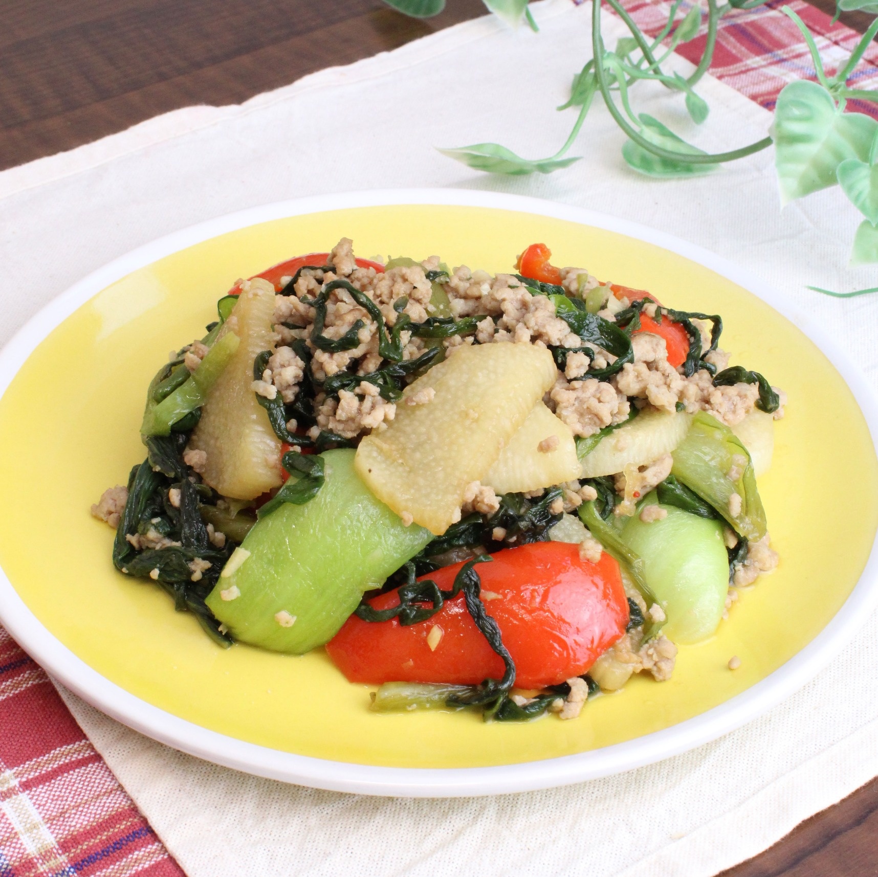 チンゲン菜と長芋のスタミナ醤油ソテー 〔材料〕2人前 チンゲン菜:2株 にら:1束 長芋:100g パプリカ(赤):1/2個 にんにく:1片 豚ひき肉:200g オリーブオイル:大さじ1/2 しょうゆ:大さじ1と1/2 みりん:大さじ1 〔作り方〕 1.チンゲン菜・にら・パプリカは3cm幅に切ります。長芋は皮をむき、1cm幅の半月切りにします。にんにくはみじん切りにします。 2.フライパンにオリーブオイル・にんにくを入れて弱火で熱し、豚ひき肉を入れ、色が変わるまで炒めます。チンゲン菜・にら・パプリカを入れてしんなりするまでさらに炒めます。長芋を入れ、しょうゆ・みりんを入れて汁気が少なくなるまで炒めたら完成です。