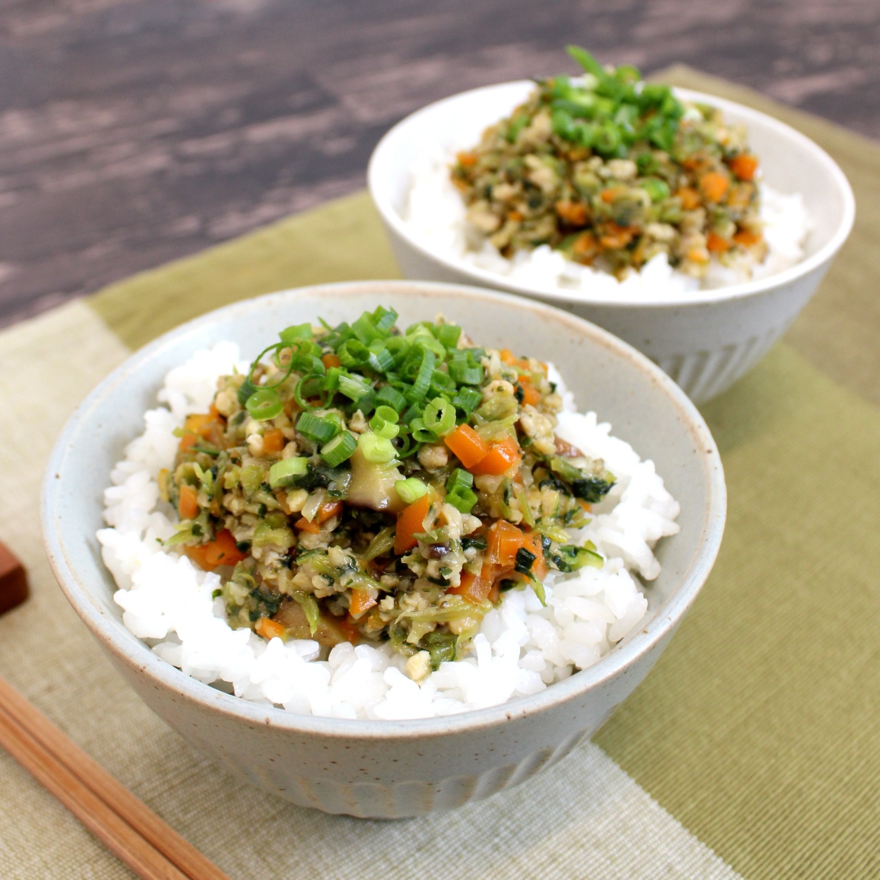 2.鍋にごま油を入れて中火で熱し、鶏ひき肉を入れ、火が通るまで炒めます。しいたけ・にんじん・長ねぎを入れ軽く炒めたら【A】を加え、煮立ったら蓋をして弱火で3分ほど煮ます。小松菜を加えて中火で熱し、水分が少なくなるまで炒めます。