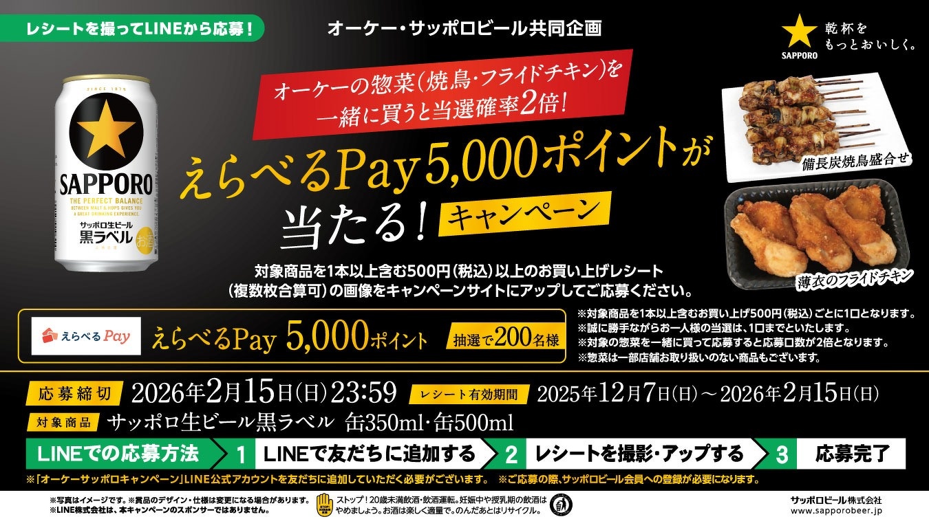 | キャンペーン名 | 【オーケー×サッポロビール共同企画】えらべるPay5,000ポイントが当たる!キャンペーン |