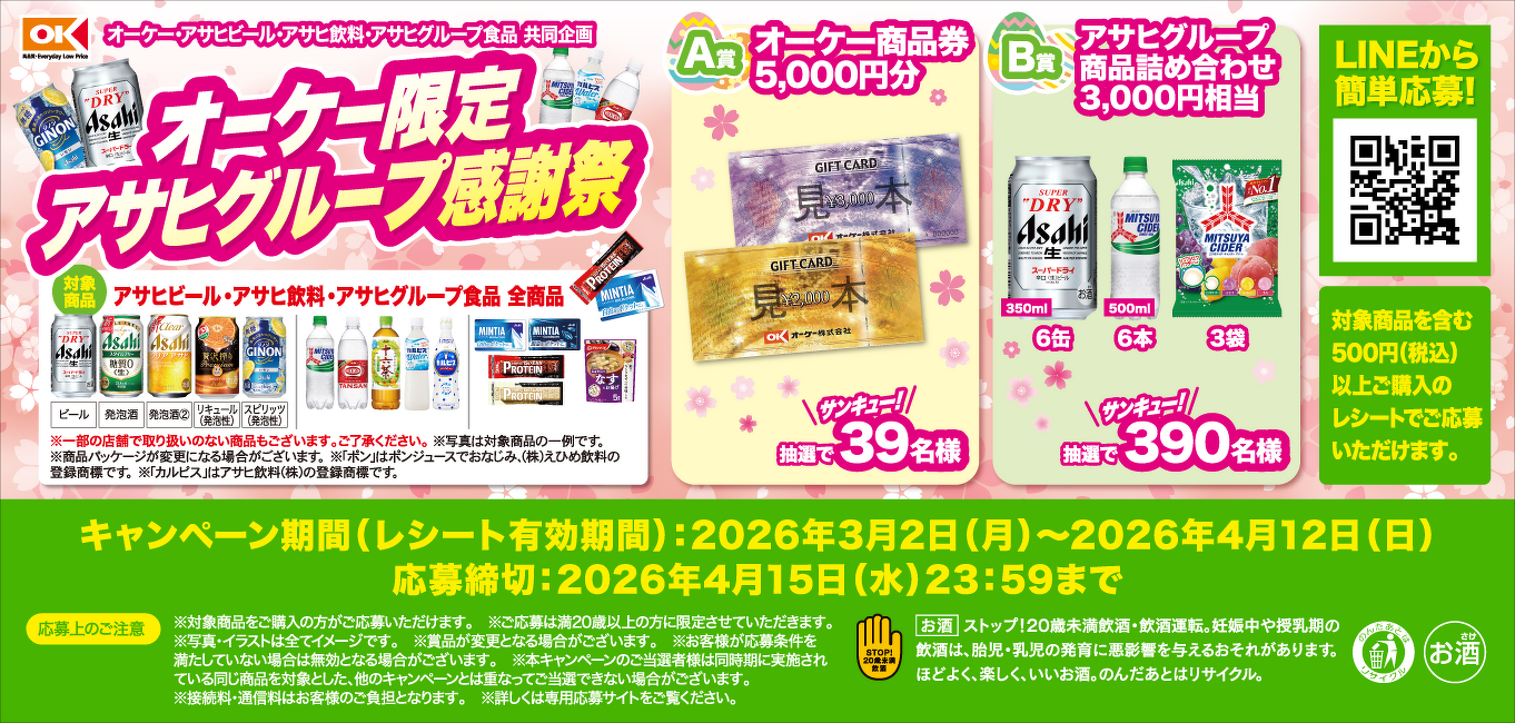 | キャンペーン名 | 【オーケー・アサヒビール・アサヒ飲料・アサヒグループ食品 共同企画】アサヒグループ感謝祭 |