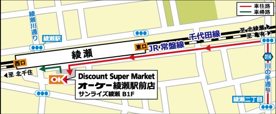 『高品質・Everyday Low Price』ディスカウント・スーパーマーケット オーケー綾瀬駅前店(東京都葛飾区)のご案内です。店舗からのお知らせ、取扱商品、チラシ掲載商品、駐車場台数、地図、営業時間、電話番号、アクセス方法などを掲載しています。