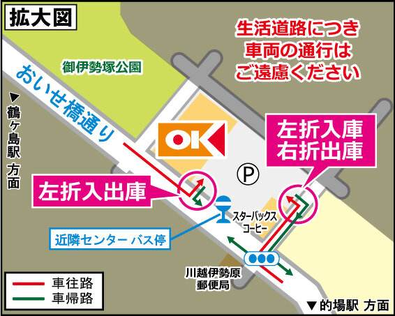 『高品質・Everyday Low Price』ディスカウント・スーパーマーケット オーケー川越伊勢原店(埼玉県川越市)のご案内です。店舗からのお知らせ、取扱商品、チラシ掲載商品、駐車場台数、地図、営業時間、電話番号、アクセス方法などを掲載しています。