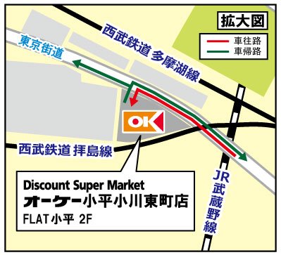 『高品質・Everyday Low Price』ディスカウント・スーパーマーケット オーケー小平小川東町店(東京都小平市)のご案内です。店舗からのお知らせ、取扱商品、チラシ掲載商品、駐車場台数、地図、営業時間、電話番号、アクセス方法などを掲載しています。