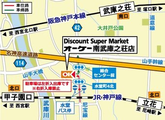 『高品質・Everyday Low Price』ディスカウント・スーパーマーケット オーケー南武庫之荘店(兵庫県尼崎市)のご案内です。店舗からのお知らせ、取扱商品、チラシ掲載商品、駐車場台数、地図、営業時間、電話番号、アクセス方法などを掲載しています。