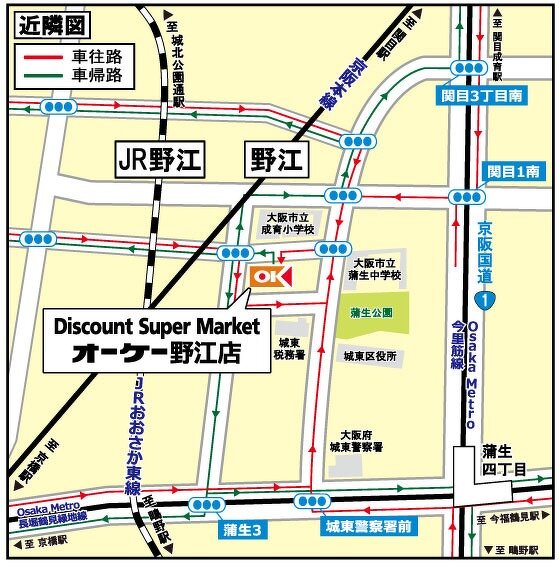 『高品質・Everyday Low Price』ディスカウント・スーパーマーケット オーケー野江店(大阪府大阪市)のご案内です。店舗からのお知らせ、取扱商品、チラシ掲載商品、駐車場台数、地図、営業時間、電話番号、アクセス方法などを掲載しています。