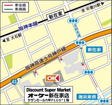 『高品質・Everyday Low Price』ディスカウント・スーパーマーケット オーケー新在家店(兵庫県神戸市)のご案内です。店舗からのお知らせ、取扱商品、チラシ掲載商品、駐車場台数、地図、営業時間、電話番号、アクセス方法などを掲載しています。